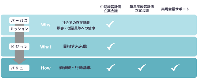 事務所では、方向性を定める「中期経営計画立案会議」、戦術を考える「単年度経営計画立案会議」、日々のふりかえりを支援する「実現会議サポート」を基本として提供しています。