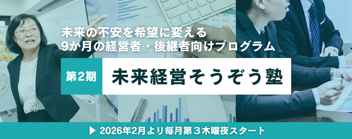| 第2講 | 2026年3月19日(木) | 18:30~20:00 | 経営理念と長期ビジョンの立て方 ※終了後、交流会を予定 自分の中でしっかり腑に落ちる理念やビジョンの描き方を身につけます。 後継者の方は、先代の考えをどう受け継ぎ、どう変えていくかも一緒に考えていきましょう。 |